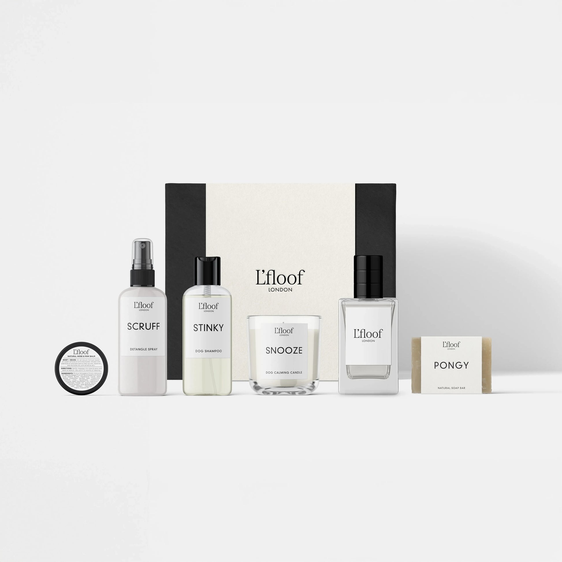 Give your furry friend the ultimate spa treatment with the L'floof Dog Grooming Set! Perfect for dogs of all sizes, this grooming kit will keep your pup looking and feeling their best for all the holiday festivities. Dog grooming gift set featuring L'floof miniatures. Packaged in a premium black magnetic box and card sleeve. Included in set: Shampoo (100ml) Detangle spray (100ml) Perfume (25ml) Candle (90ml) Paw & Nose balm (15ml) Soap bar (80g) Plastic free poop bags (1 roll)