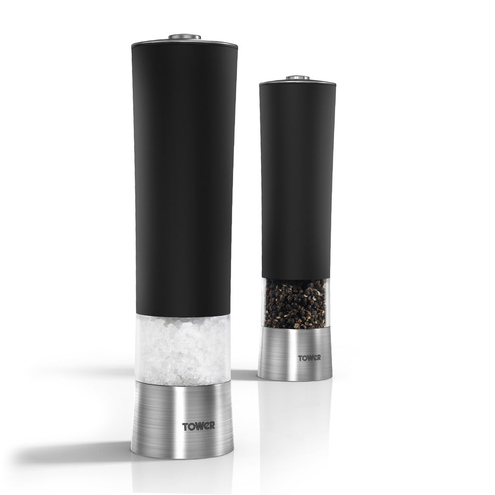 Add seasoning to soups, salads and other meals at the touch of a button with this stylish salt and pepper mill set. Suitable for all types of herbs and spices, these mills will efficiently grind peppercorns, rock salt and other common seasonings. The LED light on the base illuminates when in use, allowing you to accurately dispense your seasoning wherever you want it, while the acrylic viewing window allows you to easily monitor levels and refill when required. The salt and pepper mills in this set are complete with a soft-touch rubberised body, for a firm yet comfortable grip, and requires 4 x AA batteries (not included) to operate.