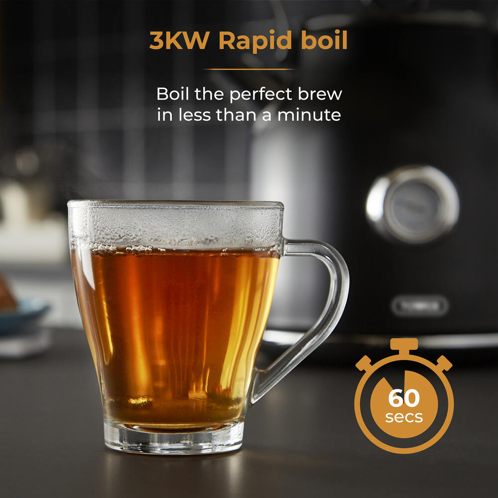 Boil the perfect brew in less than a minute with the Tower 3KW Black Kettle. The 1.7L capacity lets you make up to 7 cups of tea or coffee from one fill, perfect when hosting your family and friends. Designed to prevent messy spills when making your brew, the perfect pour and easy fill spout makes for a more convenient all-round kettle. Keep the cuppas flowing without any distraction using the kettles quiet boil function ideal for morning brews when you're trying not to wake the family. The stylish design of this kettle will make a statement on your kitchen countertop, adding a touch of class to your electrical appliances and fits perfectly with the Tower Renaissance Black 2 Slice Toaster