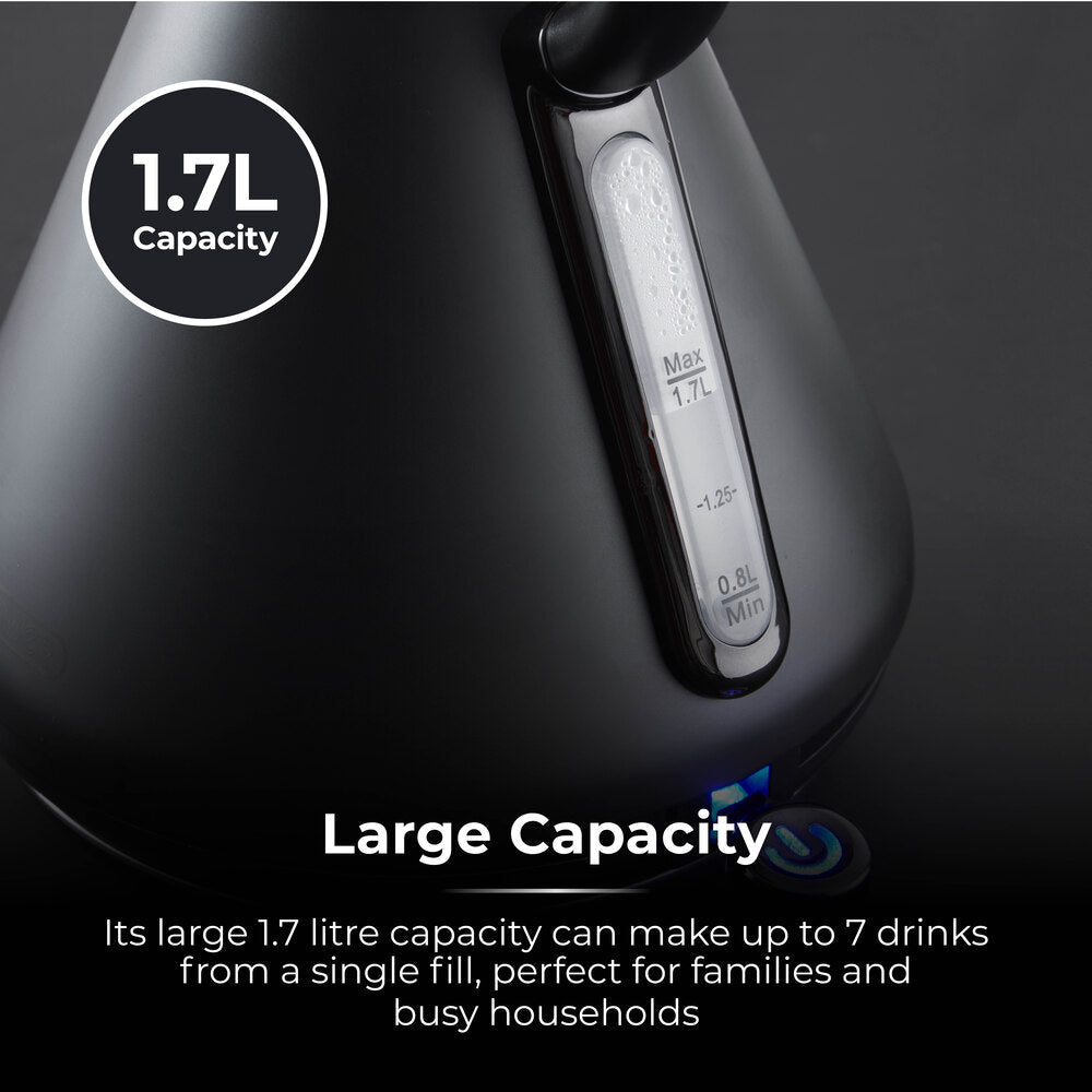 Add contemporary style to your kitchen with this elegant Sera Pyramid Kettle from Tower. It features a matte black finish with a smoked black trim, making it an eye=catching addition to any countertop. Full of modern functionality, it's powered by rapid boil technology to reduce your wait for a delicious hot drink, boiling 1 cup in less than 60 seconds. A large 1.7L capacity lets you make up to 7 drinks from a single fill, ideal for families and busy households alike. With a detachable filter, you can easily remove and rinse away limescale to keep your coffee and tea tasting its best. The perfect pour spout protects against boiling hot water spillages, while the 360-degree swivel base and fully removable lid make it simple to lift and refill the kettle no matter whether you're left or right-handed.