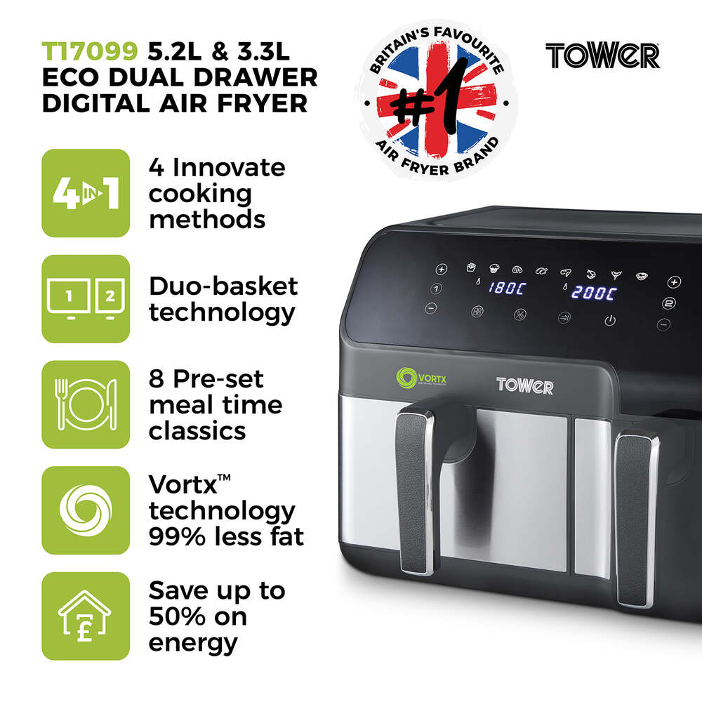 Tower Vortex Eco Dual Digital Air Fryer with 5.2L & 3.3L Drawers