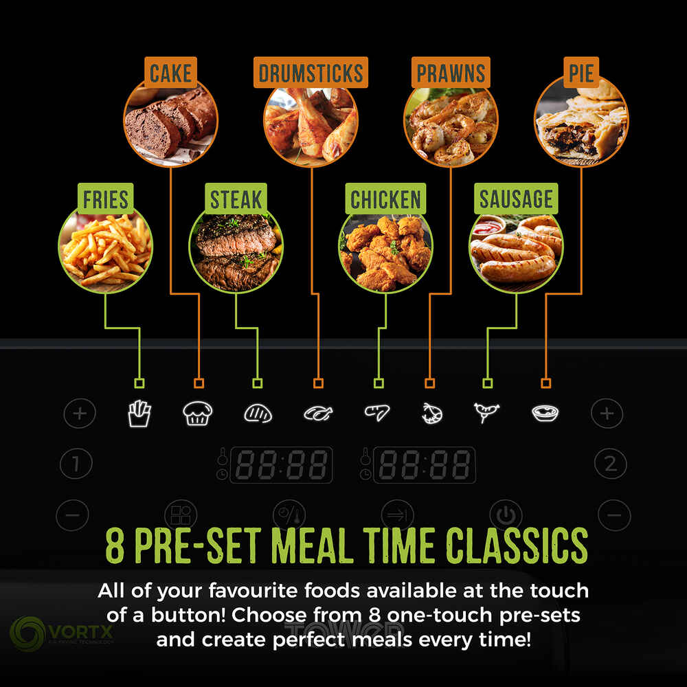 Exclusive to Tower Air Fryers, Vortx technology rapidly circulates hot air around food. Cooking up to 30% faster than a conventional oven and using 99% less oil, allowing you to save up to 50% on your energy. The Two Eco Dual Drawer Air Fryer boasts two different size baskets to provide the ultimate in air frying versatility. Giving you the freedom to cook single portions or larger portions, as required.You can cook separate meals simultaneously in the 3.3L and 5.2L drawers with a combined capacity of 8.5L, enough to feed 8 people at once. The Smart Finish control will adjust cook times automatically, so that both baskets finish cooking at the same time. You can also choose from 8 one-touch pre-sets to take the guess work out of cooking.
